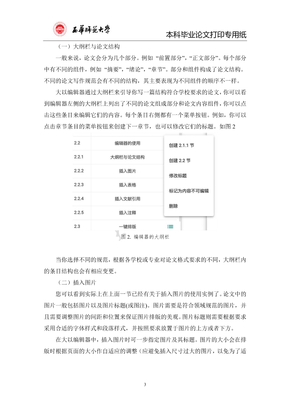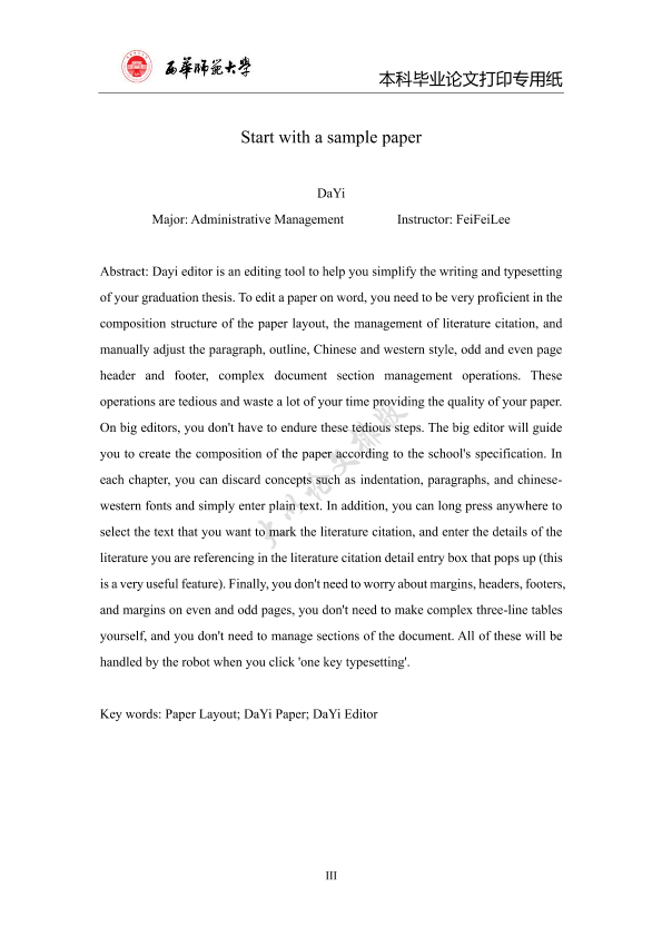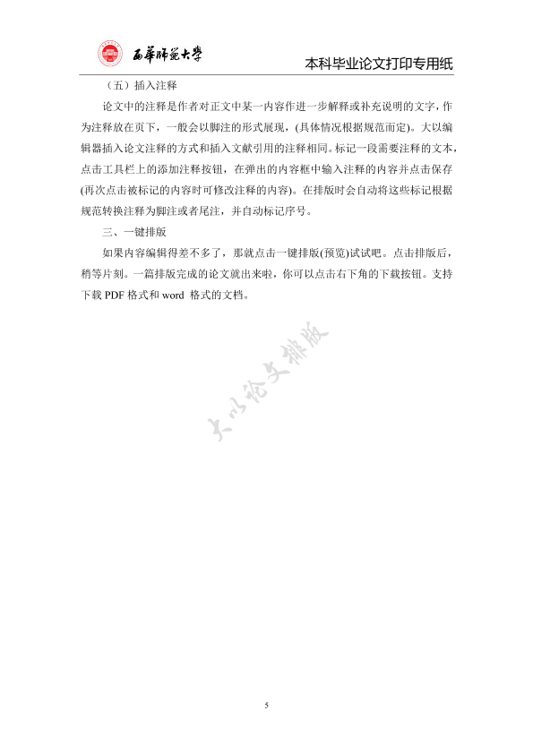 大以论文现已支持西华师范大学论文写作规范,您无需使用word或latex手动修改论文格式。繁琐的论文排版操作交给大以, 所有的排版工作由机器自动完成。准确,高效。