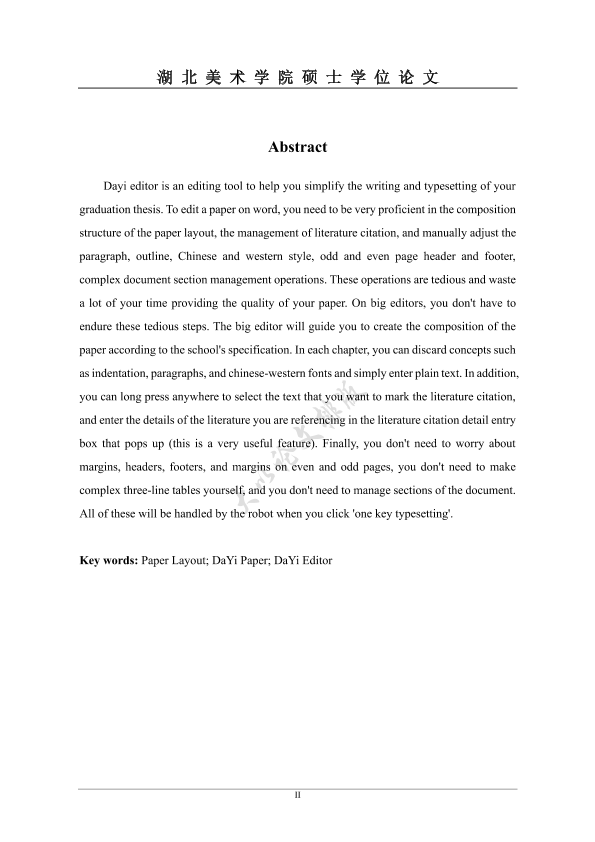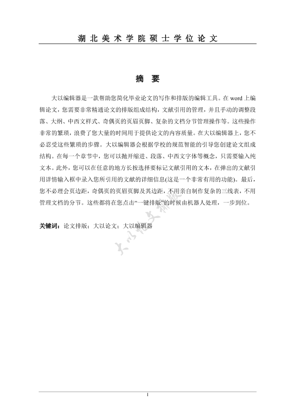大以论文现已支持湖北美术学院论文写作规范,您无需使用word或latex手动修改论文格式。繁琐的论文排版操作交给大以, 所有的排版工作由机器自动完成。准确,高效。